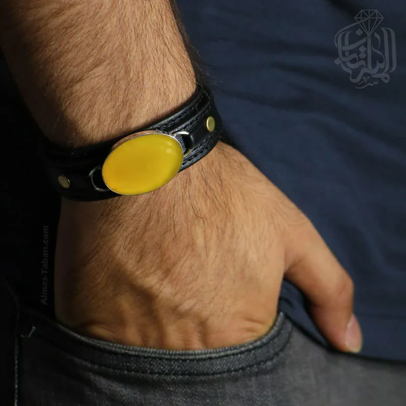 دستبند تلفیقی نقره و چرم مردانه با سنگ عقیق زرد با حکاکی ذکر شرف الشمس ، قاب سنگ از نقره اصل با عیار بین المللی 925 ساخته شده و دارای ضخامت استاندارد و کیفیت بالایی میباشد ، تمامی شرف الشمس های گالری الماس تابان با رعایت کلیه آداب مربوطه و در ساعت خاص حکاکی می شوند. دستبند انتخابی شما قابل سایز میباشد و شما خودتان میتوانید به راحتی سایز دستبند را تغییر دهید.