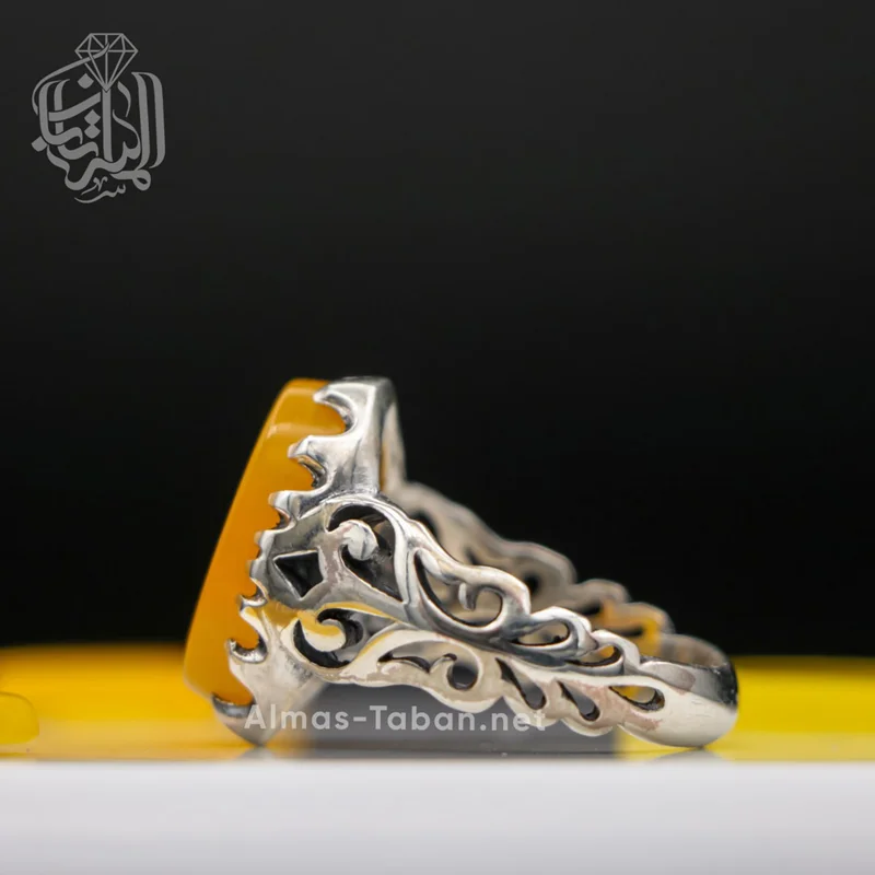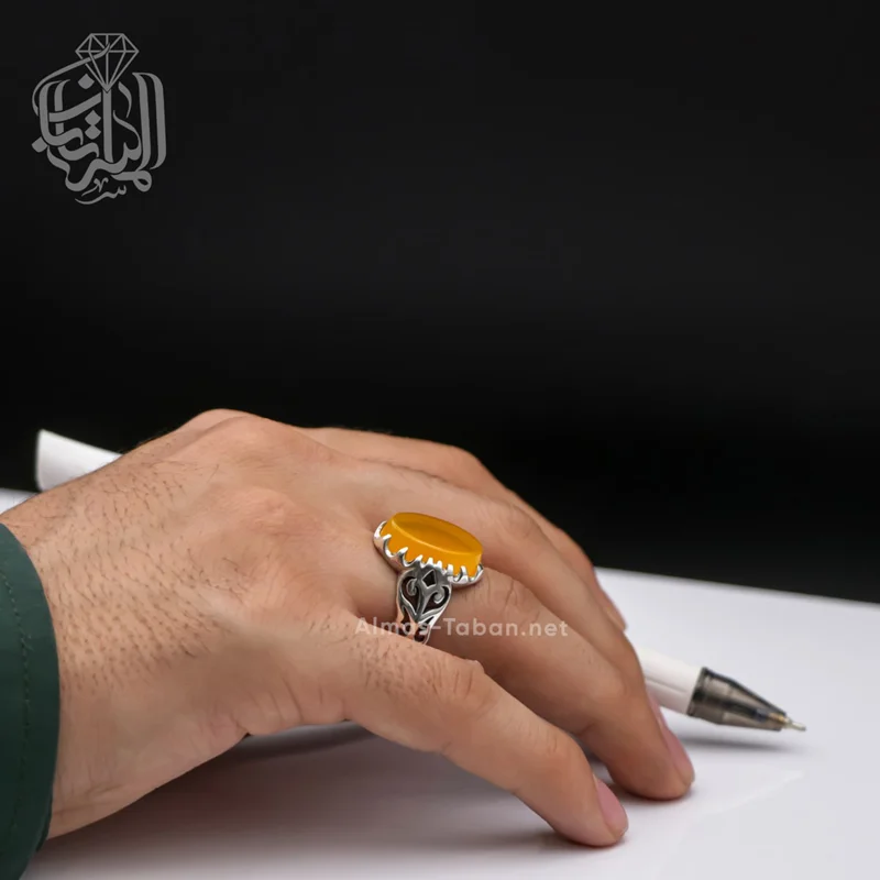 انگشتر نقره مردانه با سنگ عقیق زرد ( آماده حکاکی ذکر شرف الشمس با کلیه آداب مربوطه و به نام شما در 19 فروردین ماه) ، رکاب این انگشتر از نقره اصل با عیار بین المللی 925 ساخته شده و دارای ضخامت استاندارد و کیفیت بالایی می‌باشد.تمامی شرف الشمس های گالری الماس تابان با رعایت کلیه آداب مربوطه و در ساعت خاص و در صورت تمایل به نام شخص حکاکی می شوند. چنانچه تمایل دارید این دعا به نام شما و اختصاصی نوشته شود لطفا در هنگام ثبت سفارش در قسمت توضیحات نام کوچک خود و نام کوچک مادر خود را درج نمایید.