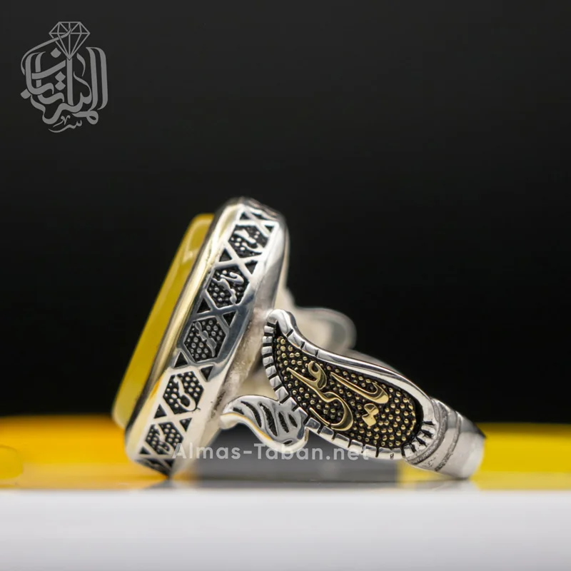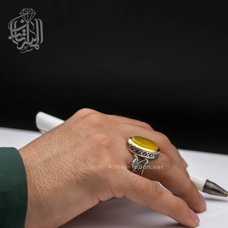 انگشتر نقره مردانه با سنگ عقیق زرد ( آماده حکاکی ذکر شرف الشمس با کلیه آداب مربوطه و به نام شما در 19 فروردین ماه) ، رکاب این انگشتر از نقره اصل با عیار بین المللی 925 ساخته شده و دارای ضخامت استاندارد و کیفیت بالایی می‌باشد.تمامی شرف الشمس های گالری الماس تابان با رعایت کلیه آداب مربوطه و در ساعت خاص و در صورت تمایل به نام شخص حکاکی می شوند. چنانچه تمایل دارید این دعا به نام شما و اختصاصی نوشته شود لطفا در هنگام ثبت سفارش در قسمت توضیحات نام کوچک خود و نام کوچک مادر خود را درج نمایید.