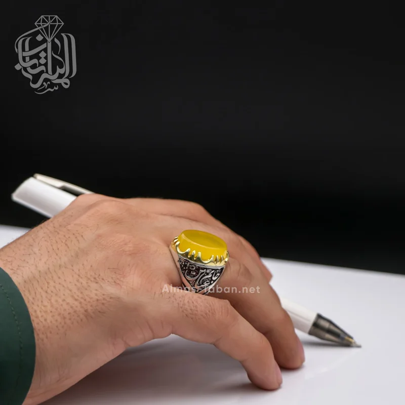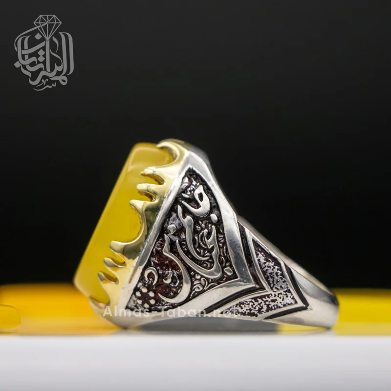 انگشتر نقره مردانه با سنگ عقیق زرد ( آماده حکاکی ذکر شرف الشمس با کلیه آداب مربوطه و به نام شما در 19 فروردین ماه) ، رکاب این انگشتر از نقره اصل با عیار بین المللی 925 ساخته شده و دارای ضخامت استاندارد و کیفیت بالایی می‌باشد.تمامی شرف الشمس های گالری الماس تابان با رعایت کلیه آداب مربوطه و در ساعت خاص و در صورت تمایل به نام شخص حکاکی می شوند. چنانچه تمایل دارید این دعا به نام شما و اختصاصی نوشته شود لطفا در هنگام ثبت سفارش در قسمت توضیحات نام کوچک خود و نام کوچک مادر خود را درج نمایید.