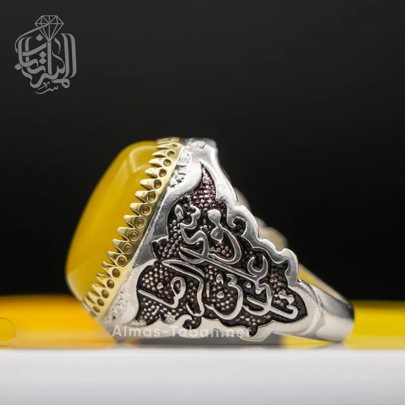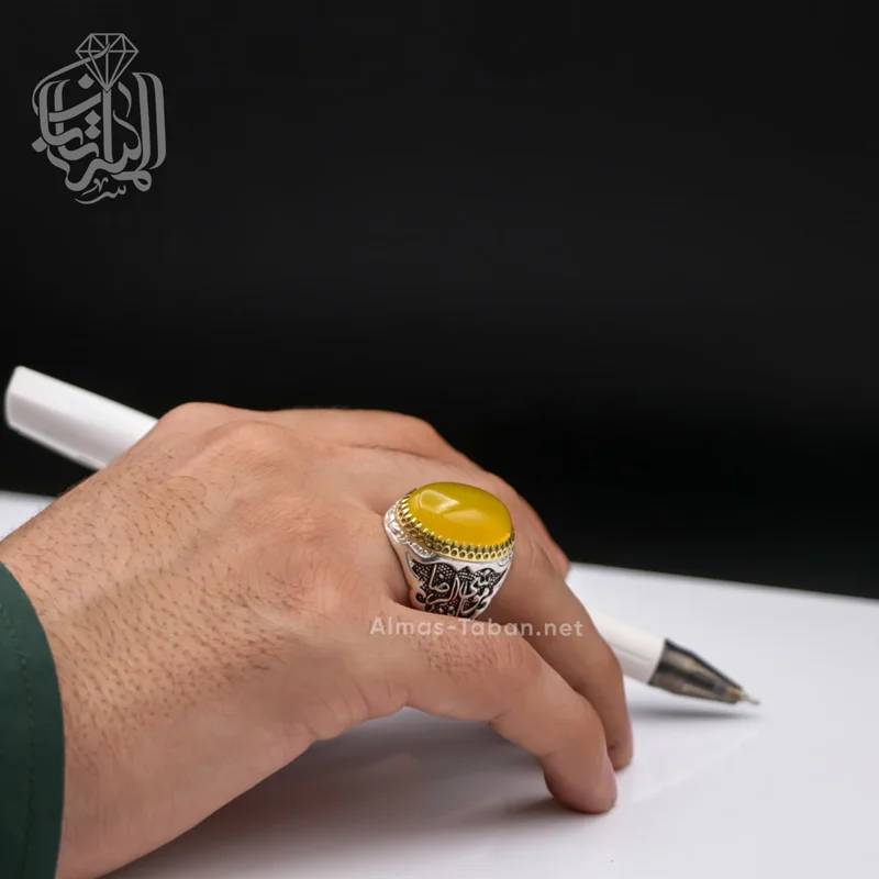 انگشتر نقره مردانه با سنگ عقیق زرد ( آماده حکاکی ذکر شرف الشمس با کلیه آداب مربوطه و به نام شما در 19 فروردین ماه) ، رکاب این انگشتر از نقره اصل با عیار بین المللی 925 ساخته شده و دارای ضخامت استاندارد و کیفیت بالایی می‌باشد.تمامی شرف الشمس های گالری الماس تابان با رعایت کلیه آداب مربوطه و در ساعت خاص و در صورت تمایل به نام شخص حکاکی می شوند. چنانچه تمایل دارید این دعا به نام شما و اختصاصی نوشته شود لطفا در هنگام ثبت سفارش در قسمت توضیحات نام کوچک خود و نام کوچک مادر خود را درج نمایید.
