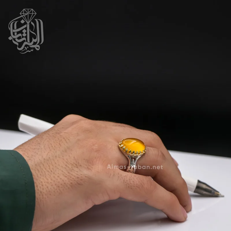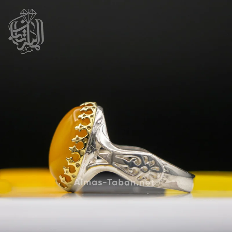 انگشتر نقره مردانه با سنگ عقیق زرد ( آماده حکاکی ذکر شرف الشمس با کلیه آداب مربوطه و به نام شما در 19 فروردین ماه) ، رکاب این انگشتر از نقره اصل با عیار بین المللی 925 ساخته شده و دارای ضخامت استاندارد و کیفیت بالایی می‌باشد.تمامی شرف الشمس های گالری الماس تابان با رعایت کلیه آداب مربوطه و در ساعت خاص و در صورت تمایل به نام شخص حکاکی می شوند. چنانچه تمایل دارید این دعا به نام شما و اختصاصی نوشته شود لطفا در هنگام ثبت سفارش در قسمت توضیحات نام کوچک خود و نام کوچک مادر خود را درج نمایید.
