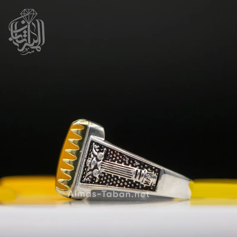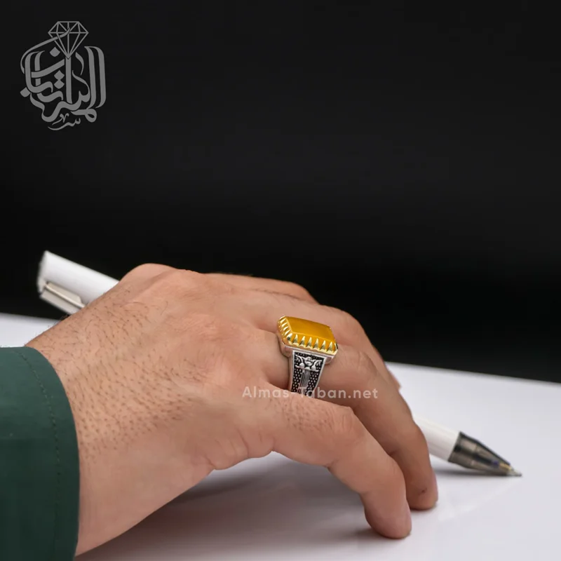 انگشتر نقره مردانه با سنگ عقیق زرد ( آماده حکاکی ذکر شرف الشمس با کلیه آداب مربوطه و به نام شما در 19 فروردین ماه) ، رکاب این انگشتر از نقره اصل با عیار بین المللی 925 ساخته شده و دارای ضخامت استاندارد و کیفیت بالایی میباشد.تمامی شرف الشمس های گالری الماس تابان با رعایت کلیه آداب مربوطه و در ساعت خاص و در صورت تمایل به نام شخص حکاکی می شوند. چنانچه تمایل دارید این دعا به نام شما و اختصاصی نوشته شود لطفا در هنگام ثبت سفارش در قسمت توضیحات نام کوچک خود و نام کوچک مادر خود را درج نمایید.