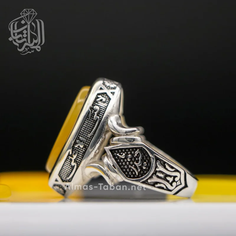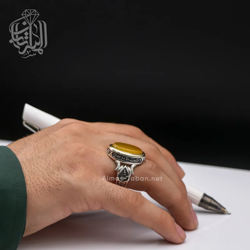 انگشتر نقره مردانه با سنگ عقیق زرد ( آماده حکاکی ذکر شرف الشمس با کلیه آداب مربوطه و به نام شما در 19 فروردین ماه) ، رکاب این انگشتر از نقره اصل با عیار بین المللی 925 ساخته شده و دارای ضخامت استاندارد و کیفیت بالایی می‌باشد.تمامی شرف الشمس های گالری الماس تابان با رعایت کلیه آداب مربوطه و در ساعت خاص و در صورت تمایل به نام شخص حکاکی می شوند. چنانچه تمایل دارید این دعا به نام شما و اختصاصی نوشته شود لطفا در هنگام ثبت سفارش در قسمت توضیحات نام کوچک خود و نام کوچک مادر خود را درج نمایید.