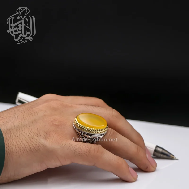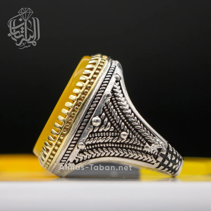 انگشتر نقره مردانه با سنگ عقیق زرد ( آماده حکاکی ذکر شرف الشمس با کلیه آداب مربوطه و به نام شما در 19 فروردین ماه) ، رکاب این انگشتر از نقره اصل با عیار بین المللی 925 ساخته شده و دارای ضخامت استاندارد و کیفیت بالایی می‌باشد.تمامی شرف الشمس های گالری الماس تابان با رعایت کلیه آداب مربوطه و در ساعت خاص و در صورت تمایل به نام شخص حکاکی می شوند. چنانچه تمایل دارید این دعا به نام شما و اختصاصی نوشته شود لطفا در هنگام ثبت سفارش در قسمت توضیحات نام کوچک خود و نام کوچک مادر خود را درج نمایید.