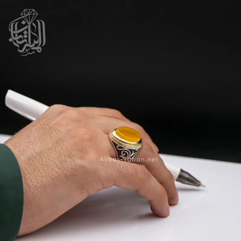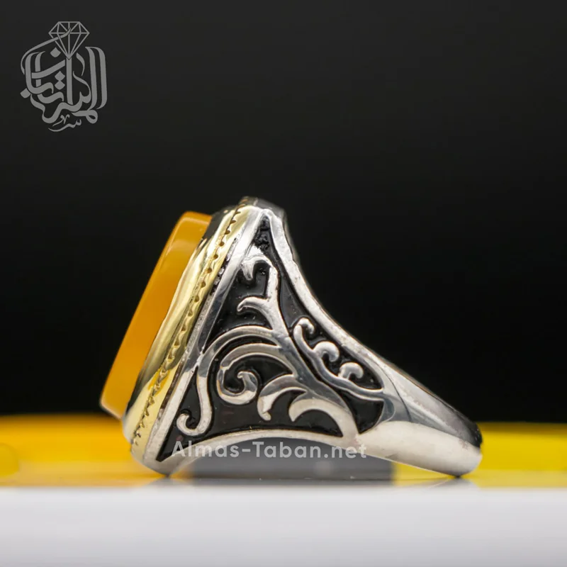 انگشتر نقره مردانه با سنگ عقیق زرد ( آماده حکاکی ذکر شرف الشمس با کلیه آداب مربوطه و به نام شما در 19 فروردین ماه) ، رکاب این انگشتر از نقره اصل با عیار بین المللی 925 ساخته شده و دارای ضخامت استاندارد و کیفیت بالایی می‌باشد.تمامی شرف الشمس های گالری الماس تابان با رعایت کلیه آداب مربوطه و در ساعت خاص و در صورت تمایل به نام شخص حکاکی می شوند. چنانچه تمایل دارید این دعا به نام شما و اختصاصی نوشته شود لطفا در هنگام ثبت سفارش در قسمت توضیحات نام کوچک خود و نام کوچک مادر خود را درج نمایید.