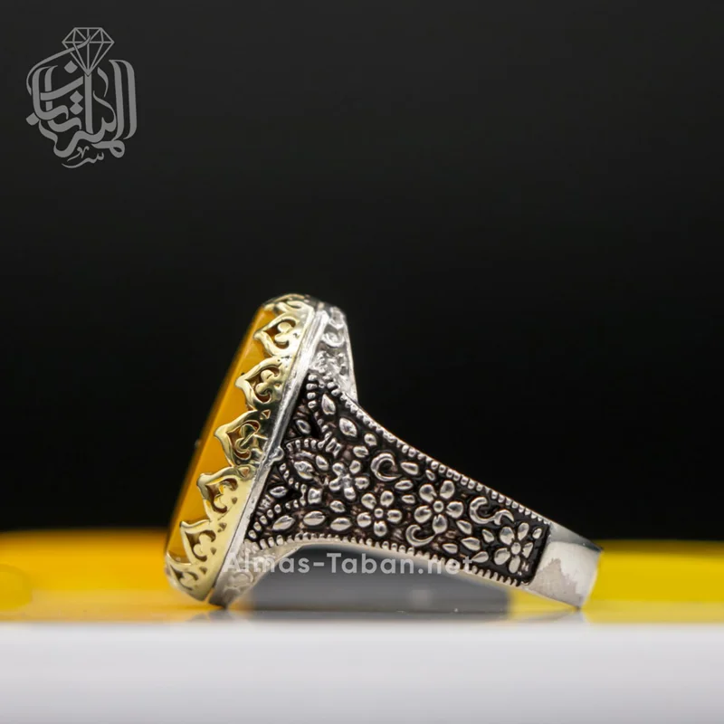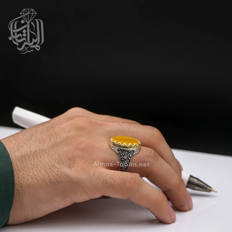 انگشتر نقره مردانه با سنگ عقیق زرد ( آماده حکاکی ذکر شرف الشمس با کلیه آداب مربوطه و به نام شما در 19 فروردین ماه) ، رکاب این انگشتر از نقره اصل با عیار بین المللی 925 ساخته شده و دارای ضخامت استاندارد و کیفیت بالایی می‌باشد.تمامی شرف الشمس های گالری الماس تابان با رعایت کلیه آداب مربوطه و در ساعت خاص و در صورت تمایل به نام شخص حکاکی می شوند. چنانچه تمایل دارید این دعا به نام شما و اختصاصی نوشته شود لطفا در هنگام ثبت سفارش در قسمت توضیحات نام کوچک خود و نام کوچک مادر خود را درج نمایید.