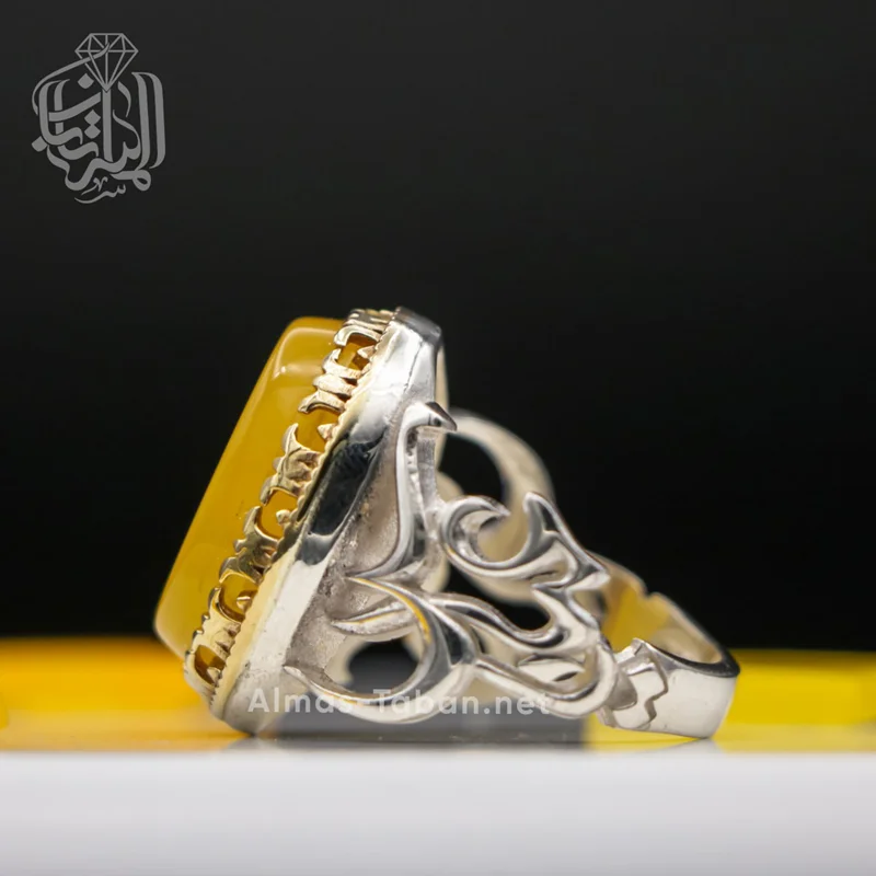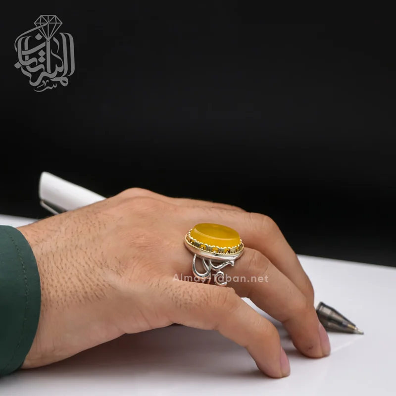 انگشتر نقره مردانه با سنگ عقیق زرد ( آماده حکاکی ذکر شرف الشمس با کلیه آداب مربوطه و به نام شما در 19 فروردین ماه) ، رکاب این انگشتر از نقره اصل با عیار بین المللی 925 ساخته شده و دارای ضخامت استاندارد و کیفیت بالایی می‌باشد.تمامی شرف الشمس های گالری الماس تابان با رعایت کلیه آداب مربوطه و در ساعت خاص و در صورت تمایل به نام شخص حکاکی می شوند. چنانچه تمایل دارید این دعا به نام شما و اختصاصی نوشته شود لطفا در هنگام ثبت سفارش در قسمت توضیحات نام کوچک خود و نام کوچک مادر خود را درج نمایید.