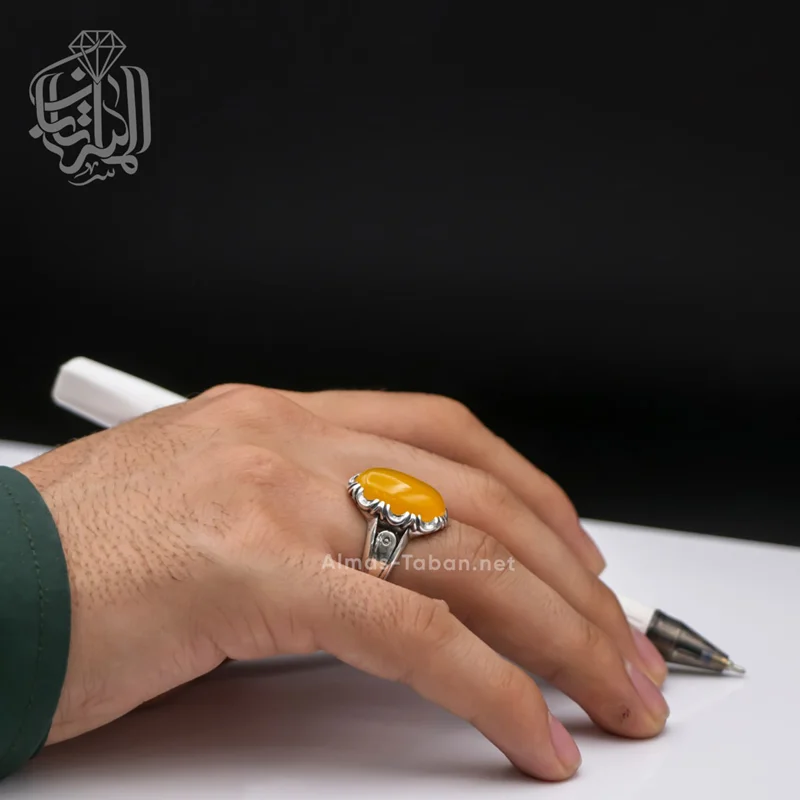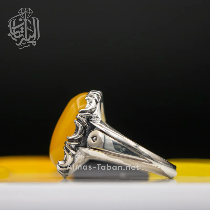 انگشتر نقره مردانه با سنگ عقیق زرد ( آماده حکاکی ذکر شرف الشمس با کلیه آداب مربوطه و به نام شما در 19 فروردین ماه) ، رکاب این انگشتر از نقره اصل با عیار بین المللی 925 ساخته شده و دارای ضخامت استاندارد و کیفیت بالایی می‌باشد.تمامی شرف الشمس های گالری الماس تابان با رعایت کلیه آداب مربوطه و در ساعت خاص و در صورت تمایل به نام شخص حکاکی می شوند. چنانچه تمایل دارید این دعا به نام شما و اختصاصی نوشته شود لطفا در هنگام ثبت سفارش در قسمت توضیحات نام کوچک خود و نام کوچک مادر خود را درج نمایید.