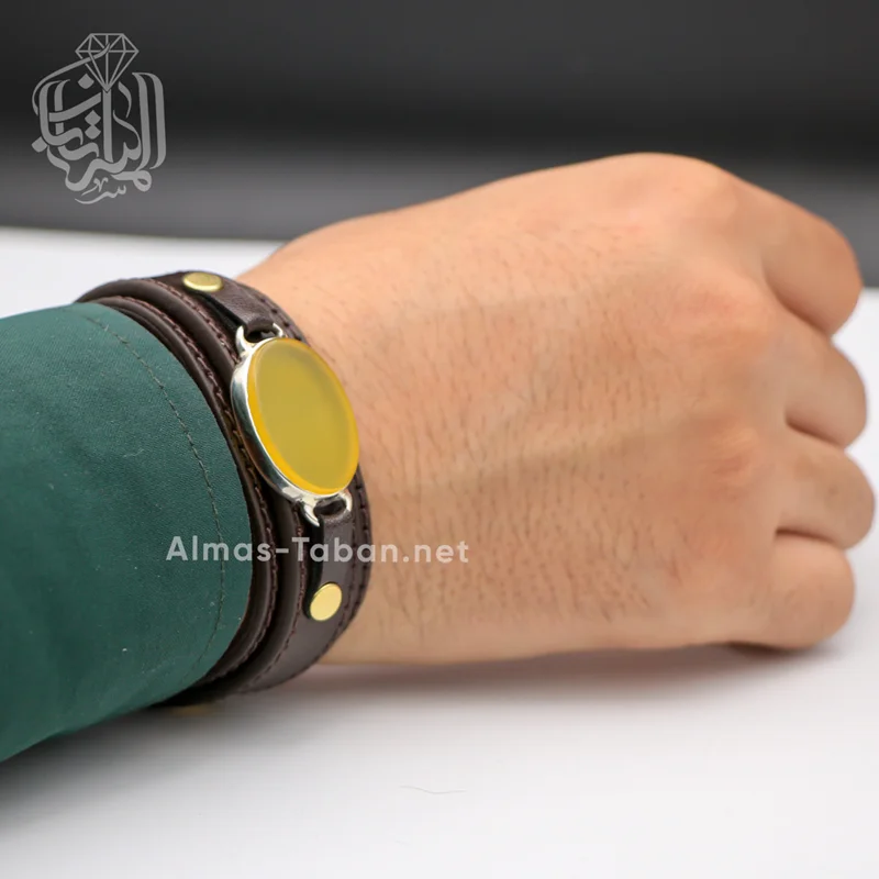 دستبند چرمی مردانه با سنگ عقیق زرد ( آماده حکاکی ذکر شرف الشمس با کلیه آداب مربوطه و به نام شما در 19 فروردین ماه) ، فریم این دستبند از نقره اصل با عیار بین المللی 925 به صورت دست ساز ساخته شده و دارای ضخامت استاندارد و کیفیت بالایی می‌باشد.تمامی شرف الشمس های گالری الماس تابان با رعایت کلیه آداب مربوطه و در ساعت خاص و در صورت تمایل به نام شخص حکاکی می شوند. چنانچه تمایل دارید این دعا به نام شما و اختصاصی نوشته شود لطفا در هنگام ثبت سفارش در قسمت توضیحات نام کوچک خود و نام کوچک مادر خود را درج نمایید.