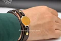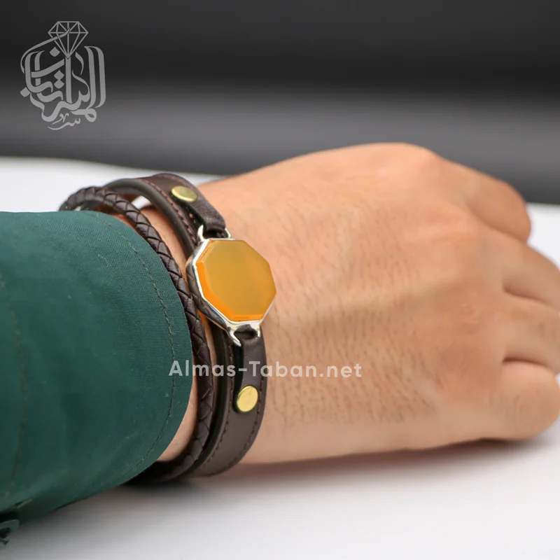 دستبند چرمی مردانه با سنگ عقیق زرد ( آماده حکاکی ذکر شرف الشمس با کلیه آداب مربوطه و به نام شما در 19 فروردین ماه) ، فریم این دستبند از نقره اصل با عیار بین المللی 925 به صورت دست ساز ساخته شده و دارای ضخامت استاندارد و کیفیت بالایی می‌باشد.تمامی شرف الشمس های گالری الماس تابان با رعایت کلیه آداب مربوطه و در ساعت خاص و در صورت تمایل به نام شخص حکاکی می شوند. چنانچه تمایل دارید این دعا به نام شما و اختصاصی نوشته شود لطفا در هنگام ثبت سفارش در قسمت توضیحات نام کوچک خود و نام کوچک مادر خود را درج نمایید.