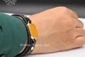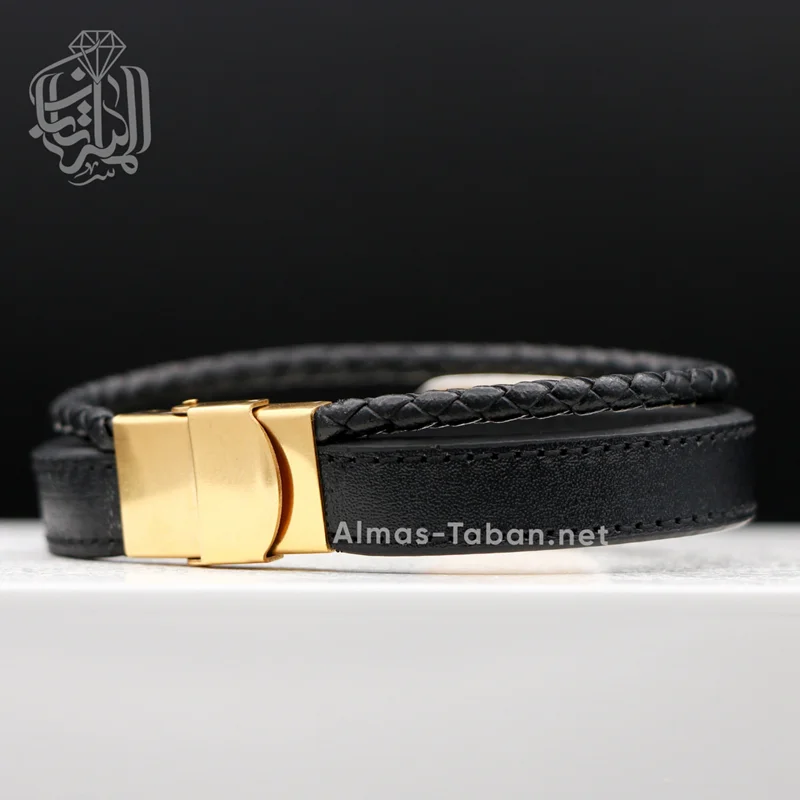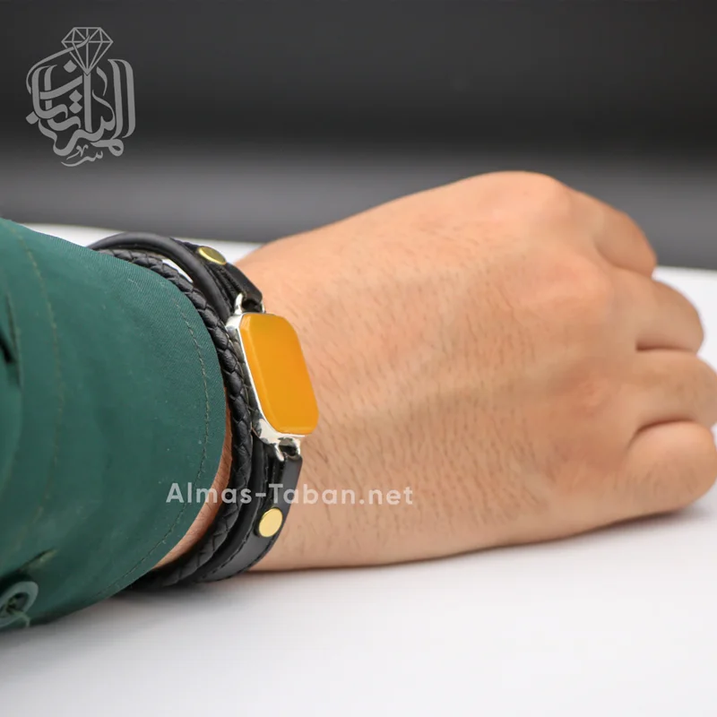 دستبند چرمی مردانه با سنگ عقیق زرد ( آماده حکاکی ذکر شرف الشمس با کلیه آداب مربوطه و به نام شما در 19 فروردین ماه) ، فریم این دستبند از نقره اصل با عیار بین المللی 925 به صورت دست ساز ساخته شده و دارای ضخامت استاندارد و کیفیت بالایی می‌باشد.تمامی شرف الشمس های گالری الماس تابان با رعایت کلیه آداب مربوطه و در ساعت خاص و در صورت تمایل به نام شخص حکاکی می شوند. چنانچه تمایل دارید این دعا به نام شما و اختصاصی نوشته شود لطفا در هنگام ثبت سفارش در قسمت توضیحات نام کوچک خود و نام کوچک مادر خود را درج نمایید.
