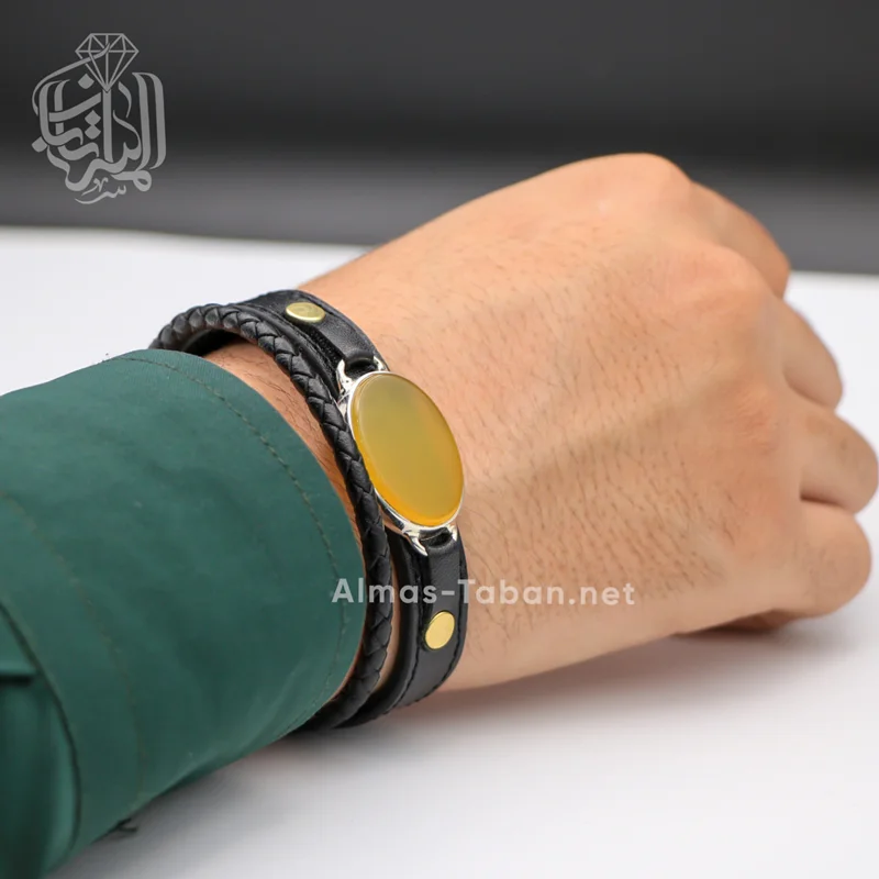 دستبند تلفیقی نقره و چرم مردانه با سنگ عقیق زرد ( آماده حکاکی ذکر شرف الشمس با کلیه آداب مربوطه و به نام شما در 19 فروردین ماه) ،قاب سنگ از نقره اصل با عیار بین المللی 925 ساخته شده و دارای ضخامت استاندارد و کیفیت بالایی میباشد ، تمامی شرف الشمس های گالری الماس تابان با رعایت کلیه آداب مربوطه و در ساعت خاص و در صورت تمایل به نام شخص حکاکی می شوند. چنانچه تمایل دارید این دعا به نام شما و اختصاصی نوشته شود لطفا در هنگام ثبت سفارش در قسمت توضیحات نام کوچک خود و نام کوچک مادر خود را درج نمایید. دستبند انتخابی شما قابل سایز میباشد و شما خودتان میتوانید به راحتی سایز دستبند را تغییر دهید.