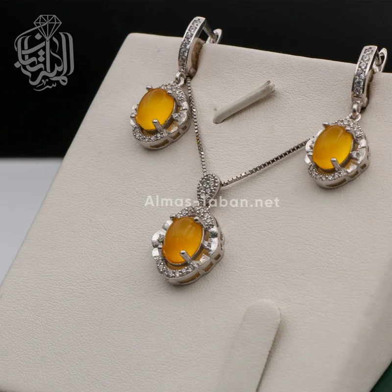 نیم ست نقره زنانه با سنگ عقیق زرد ( آماده حکاکی ذکر شرف الشمس با کلیه آداب مربوطه و به نام شما در 19 فروردین ماه) ، فریم این ست از نقره اصل با عیار بین المللی 925 ساخته شده و دارای ضخامت استاندارد و کیفیت بالایی میباشد.تمامی شرف الشمس های گالری الماس تابان با رعایت کلیه آداب مربوطه و در ساعت خاص و در صورت تمایل به نام شخص حکاکی می شوند. چنانچه تمایل دارید این دعا به نام شما و اختصاصی نوشته شود لطفا در هنگام ثبت سفارش در قسمت توضیحات نام کوچک خود و نام کوچک مادر خود را درج نمایید.