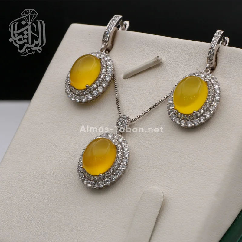 نیم ست نقره زنانه با سنگ عقیق زرد ( آماده حکاکی ذکر شرف الشمس با کلیه آداب مربوطه و به نام شما در 19 فروردین ماه) ، فریم این نیم ست از نقره اصل با عیار بین المللی 925 ساخته شده و دارای ضخامت استاندارد و کیفیت بالایی می‌باشد.تمامی شرف الشمس های گالری الماس تابان با رعایت کلیه آداب مربوطه و در ساعت خاص و در صورت تمایل به نام شخص حکاکی می شوند. چنانچه تمایل دارید این دعا به نام شما و اختصاصی نوشته شود لطفا در هنگام ثبت سفارش در قسمت توضیحات نام کوچک خود و نام کوچک مادر خود را درج نمایید.