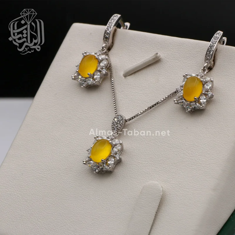 نیم ست نقره زنانه با سنگ عقیق زرد ( آماده حکاکی ذکر شرف الشمس با کلیه آداب مربوطه و به نام شما در 19 فروردین ماه) ، فریم این نیم ست از نقره اصل با عیار بین المللی 925 ساخته شده و دارای ضخامت استاندارد و کیفیت بالایی می‌باشد.تمامی شرف الشمس های گالری الماس تابان با رعایت کلیه آداب مربوطه و در ساعت خاص و در صورت تمایل به نام شخص حکاکی می شوند. چنانچه تمایل دارید این دعا به نام شما و اختصاصی نوشته شود لطفا در هنگام ثبت سفارش در قسمت توضیحات نام کوچک خود و نام کوچک مادر خود را درج نمایید.