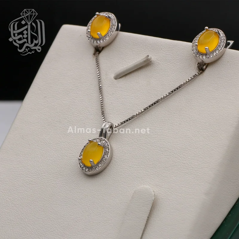 نیم ست نقره زنانه با سنگ عقیق زرد ( آماده حکاکی ذکر شرف الشمس با کلیه آداب مربوطه و به نام شما در 19 فروردین ماه) ، فریم این نیم ست از نقره اصل با عیار بین المللی 925 ساخته شده و دارای ضخامت استاندارد و کیفیت بالایی می‌باشد.تمامی شرف الشمس های گالری الماس تابان با رعایت کلیه آداب مربوطه و در ساعت خاص و در صورت تمایل به نام شخص حکاکی می شوند. چنانچه تمایل دارید این دعا به نام شما و اختصاصی نوشته شود لطفا در هنگام ثبت سفارش در قسمت توضیحات نام کوچک خود و نام کوچک مادر خود را درج نمایید.