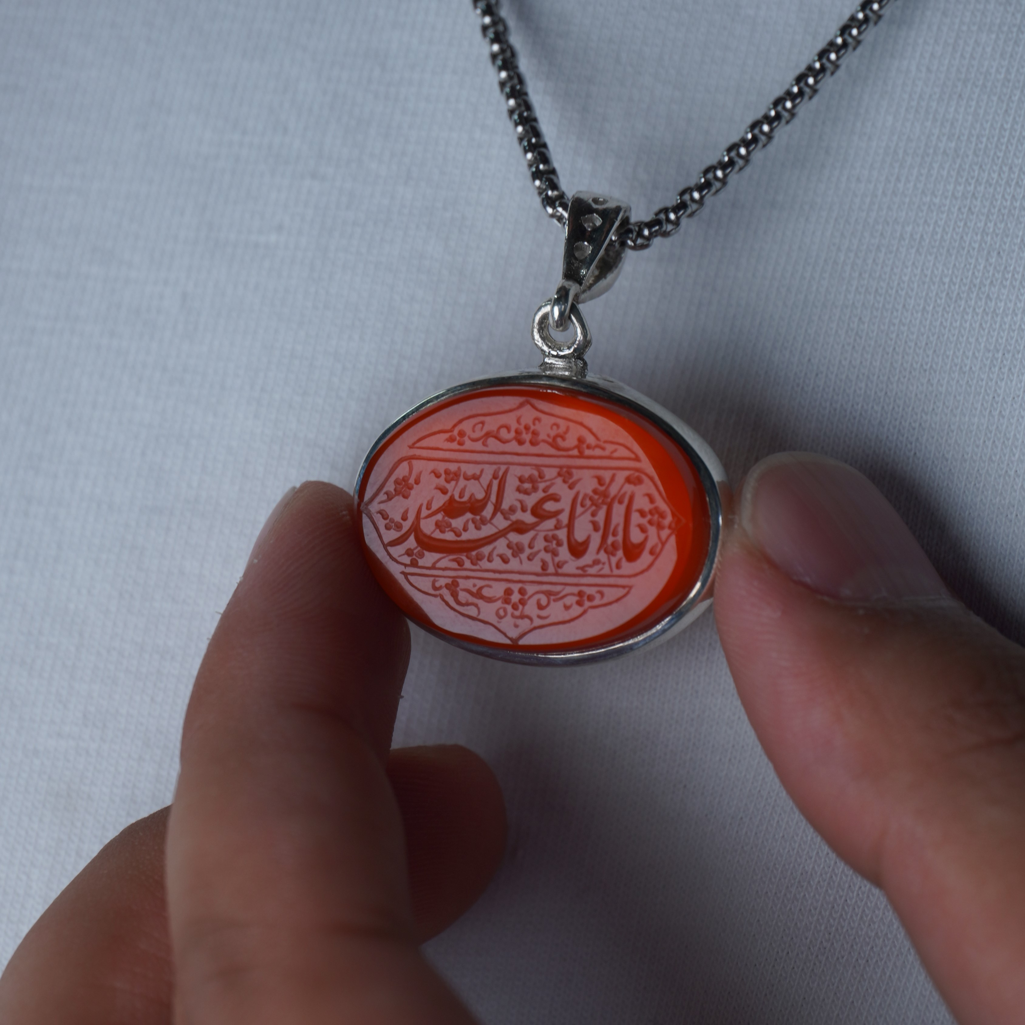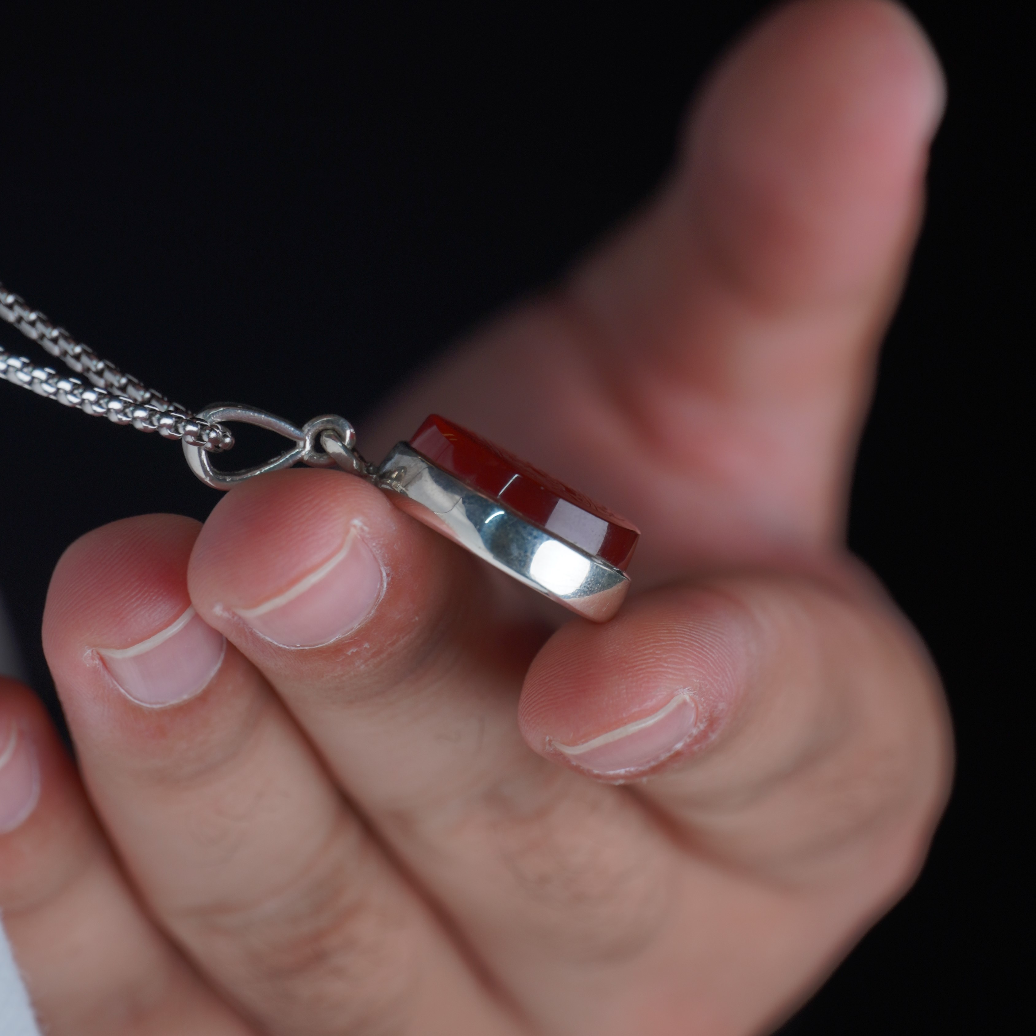 گردنبند نقره مردانه با سنگ عقیق سرخ، رکاب از نقره اصل با عیار بین المللی 925 ساخته شده و دارای ضخامت استاندارد و کیفیت بالایی میباشد.