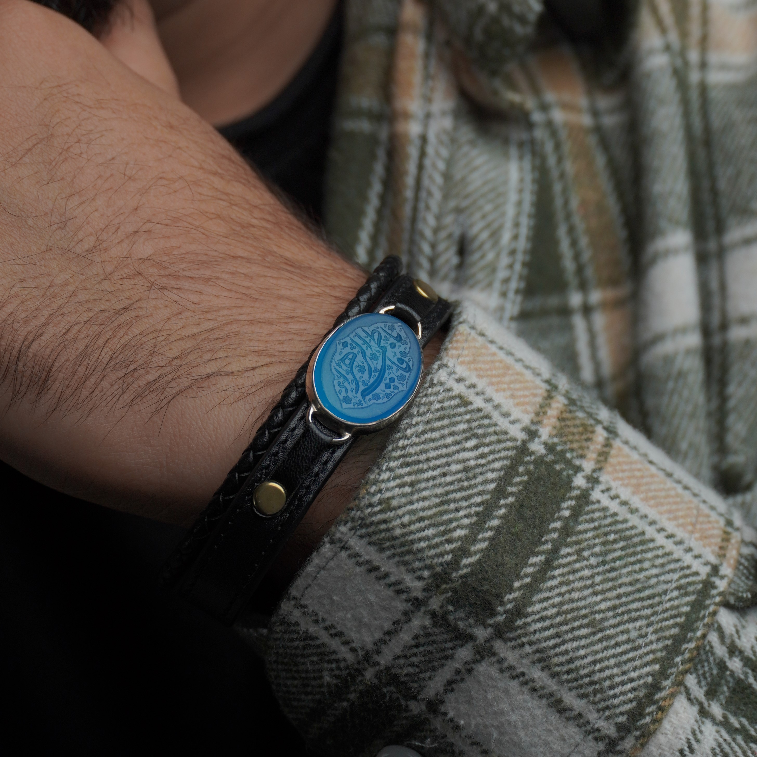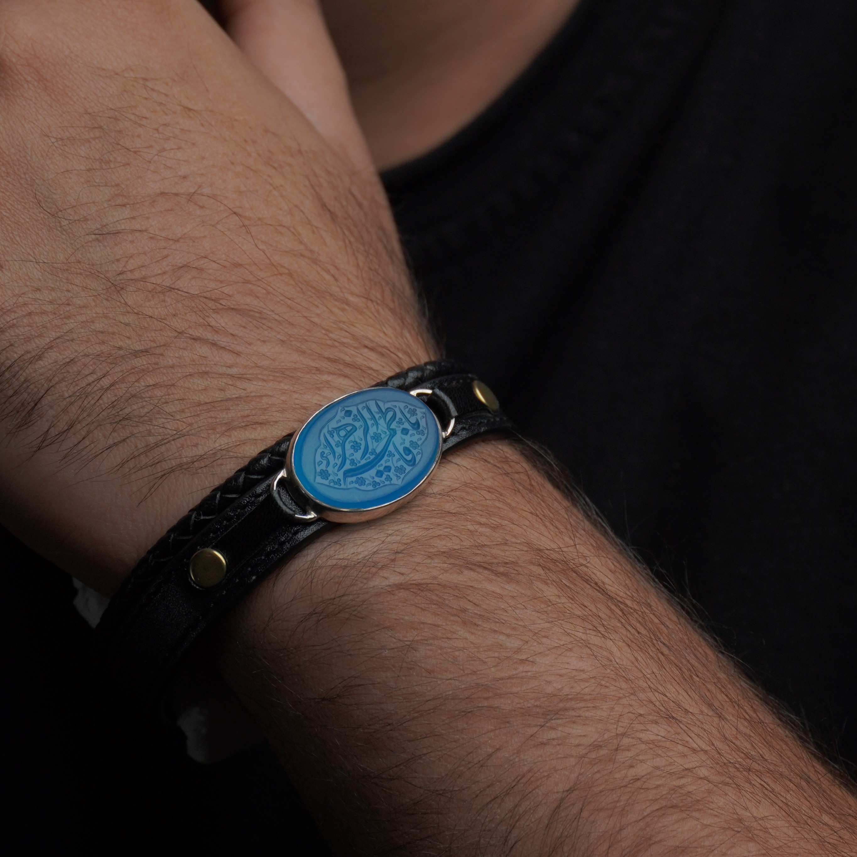 دستبند تلفیقی نقره و چرم مردانه با سنگ عقیق آبی درجه یک ، قاب سنگ از نقره اصل با عیار بین المللی 925 ساخته شده و دارای ضخامت استاندارد و کیفیت بالایی میباشد ، دستبند انتخابی شما قابل سایز میباشد و شما خودتان میتوانید به راحتی سایز دستبند را تغییر دهید.